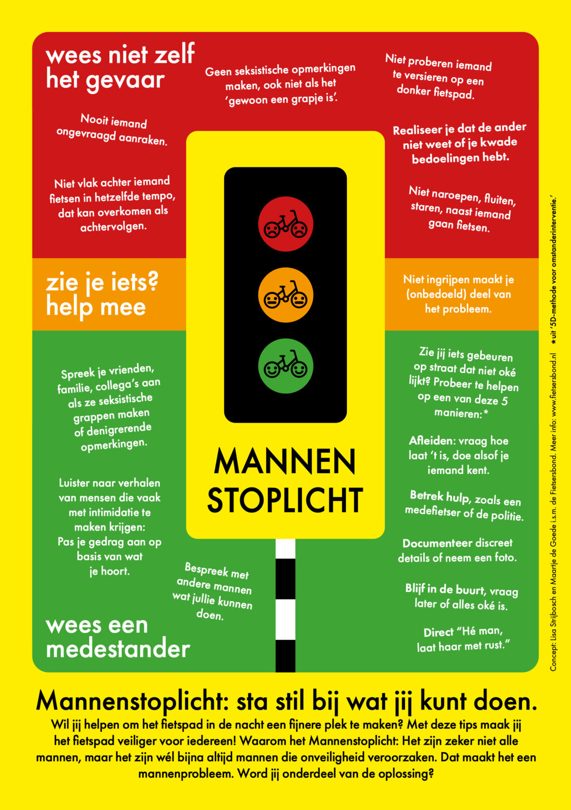 Bij de Fietsersbond heb ik al vaker samengewerkt met social designers Maartje de Goede en Lisa Strijbosch. Zij hebben bijvoorbeeld het project de Meefietslijn bedacht. In die tijd maakte een serieverkrachter Utrecht onveilig en zij bedachten dat ze telefonisch mee konden fietsen met vrouwen die over enge routes fietsten. Leverde fantastische reacties op. En nu hebben ze dan als vervolg het Mannenstoplicht bedacht. Ik vind hun werkwijze altijd onnavolgbaar. het lijkt zo simpel, maar het zit ingenieus in elkaar. Geraffineerd zou ik bijna zeggen. En ook voor hen is het spannend of mannen echt stoppen. En dat deden ze. Niet bij bosjes tegelijk want het was koud en donker en ze moesten naar sport of theaer of andere dingen. Maar het waren er genoeg en het leuke aan gesprekken met onbekenden dat er altijd iets verrassends uitkomt.