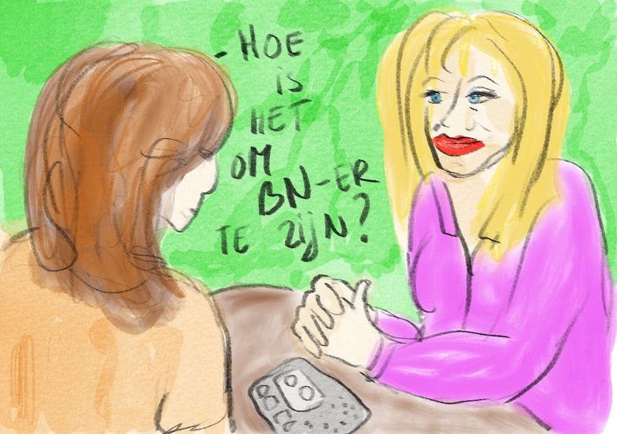Het ergste aan BN-ers interviewen, wat ik daarna vaker heb gedaan, is dat ze altijd zo druk zijn en dat je ze via een woordvoerder of manager moet benaderen. Iedereen wil hen spreken. Als niet-BN-er sta je in de rij. Sommigen vinden het in die positie heerlijk om je te laten bungelen. Zo moest ik ooit wel vier of vijf afspraken met dj Rob S. maken omdat hij nooit de telefoon opnam op de afgesproken tijd. Een keer nam hij wel op en zat hij op een terras in Utrecht: ‘Het is hier heel gezellig. Kom erbij!’